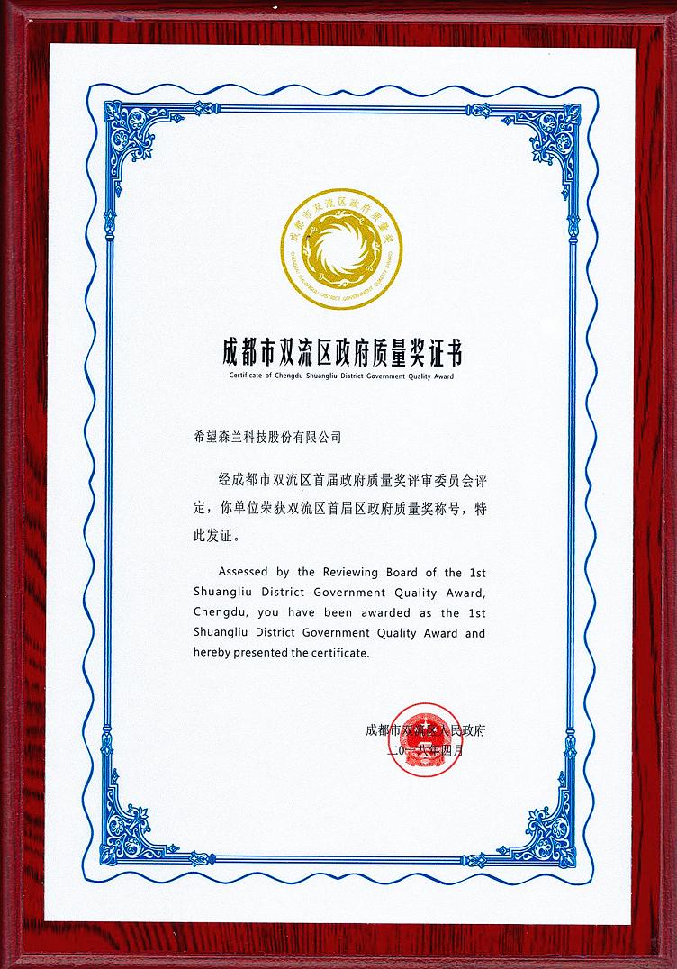 成都市双流区政府质量奖证书