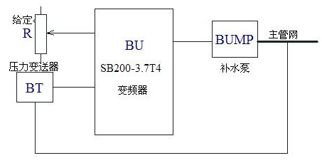 为更进一步的节能,对换热站实施了自动化改造,循环泵和补水泵用变频调节,整个城市供热系统用计算机进行监控,实现了换热站无人值守。通过循环泵使热水在供热系统中运行,管道、阀门的泄漏引起循环水的水压降低,如不及时补水,会造成供热系统运行不正常。补水泵的变频泵补水方式比较简单,采用恒压供水方式,设定压力为4kg。本例选用一台SB200-3.7T4变频器,选用森纳斯DG130W-BZ-A 1MPa压力变送器,变频调速补水系统如图所示: