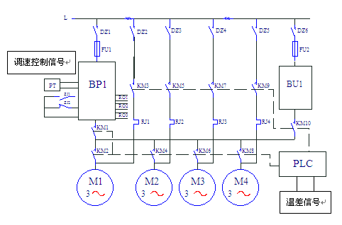 图中,BP1—永利yl23411SB200-37T4变频器,BU—软启动器(自耦减压起动器),系统采用循环投切方式,温差信号送入PLC,经过PLC处理后,到变频器作为调速控制信号。整个系统的运行信息由PLC送到计算机上。