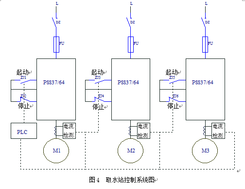 考虑到取水站无人值守,选择启动设备时着重可靠性,就选用软启动器,每台水泵配1台,共3台。沉淀池内设有“高”、“中”、“低”3个水位点,用PLC根据沉淀池水位的高低来决定1台水泵运行或2台水泵运行,还可通过编程控制使3台水泵使用的时间尽量相同。水泵的运行信号、故障信号通过电缆送到水处理站显示。取水站的抽水水位比水泵安装位置低2米,水泵初次起动或停止后再起动,都可能形成“真空”而吸不上水,原来的方式是靠人工注水。无人值守后必须自动地完成注水排气这个过程,其方法是采用间接检测方式,即检测水泵电机的运行电流。如果管道有“真空”,则电机近似于空载运行,电流较小;如果管道没有“真空”,则电机接近满载运行,电流基本上为额定电流,二者的差值较大。用电流检测来确定电机或抽水管道有无真空,如有问题,PLC给出报警信号,通知值班人员处理。