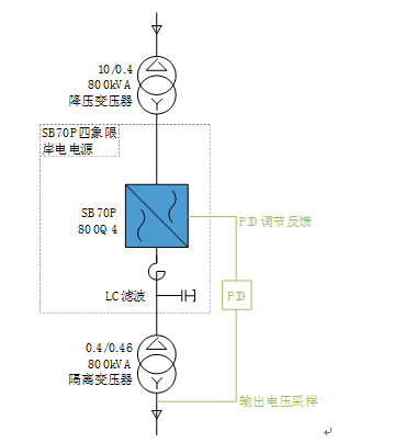 岸电系统在输出隔离变压器后端设置了输出电压采样点,该点采样得到实时输出电压值后将数据送往系统内部PID机构进行对比,将结果转换为控制指令后送往岸电系统。岸电系统对输出电压进行调节,最终输出电压达到预期输出值,岸船连接段系统压降问题被解决。