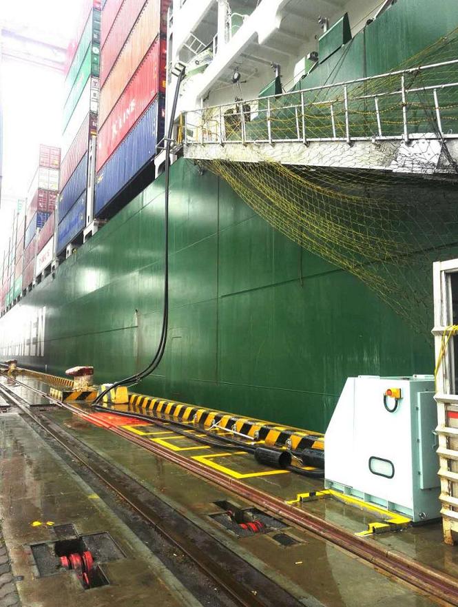 随后EVER LISSOME LONNON号船上工作人员开始放船用连接高压电缆,岸上工作人员将高压电缆连接到港口#14泊位区岸电接线箱,EVER LISSOME LONNON具有连接岸电条件。